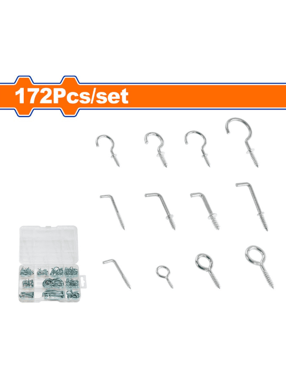 Комплект крючков: 172 шт. Материал: углеродистая сталь. Обработка поверхности: оцинкованная. Рым-винты: 50 шт. — 18 мм 20 шт. — 25 мм 6 шт. — 35 мм Крючки для чашек: 10 шт. — 19 мм 8 шт. — 25 мм 7 шт. — 31 мм 4 шт. — 38 мм Квадратные крючки: 30 Шт. - 12,5 мм 15 шт. - 19 мм 10 шт. - 25 мм Крючки с винтами типа «L» 9 шт. - 40 мм 3 шт. - 50 мм. Упакованы в пластиковую коробку