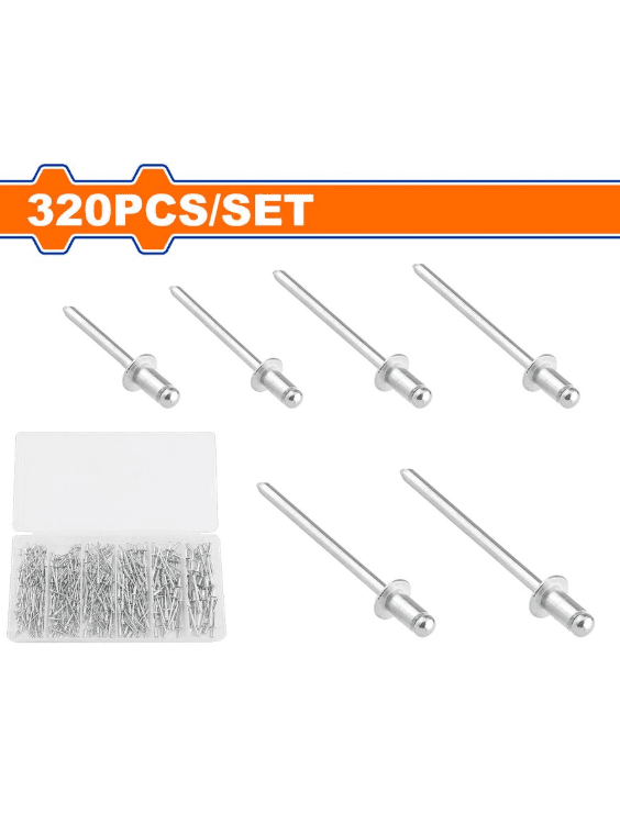 320 шт./компл. Материал: алюминий и углеродистая сталь. Обработка поверхности: анодное окисление + оцинковка. В комплект входят: 80 шт. 2,4x5,5 мм, 60 шт., 3,2x3,2 мм, 50 шт., 3,2x6,0 мм, 60 шт., 3,2x7,5 мм, 40 шт., 4,0x8,0 мм, 30 шт., 4,8. x8,0 мм Упаковано в пластиковую коробку.