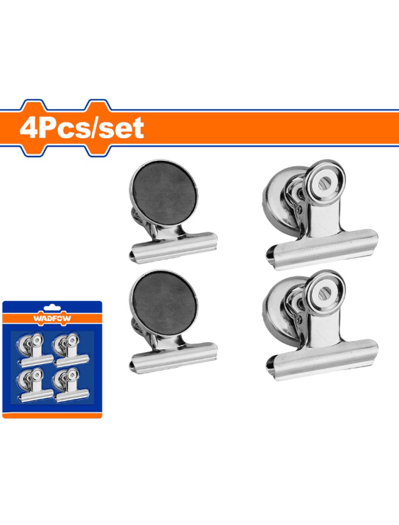 Набор из 4 магнитных зажимов. Размер: диаметр 28 мм. Сила магнитной силы: 0,35 кг. Обработка поверхности: никелирование. Упаковано в блистерную упаковку.