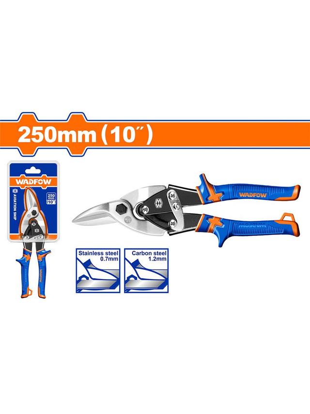 Авиационные ножницы (правые) Длина: 250 мм (10 дюймов) Макс. толщина реза: углеродистая сталь ≤1,2 мм Нержавеющая сталь ≤0,7 мм Уникальный дизайн, двухцветная мягкая ручка Упаковано в половинный двойной блистер