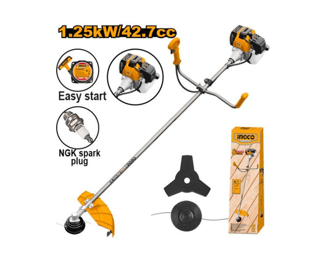 Рабочий объем: 42,7 куб. см Номинальная мощность: 1,25 кВт Максимальная скорость: 8000 об/мин Максимальная длина резки: 420 мм Объем топливного бака: 1200 мл Мощный двухтактный бензиновый двигатель с воздушным охлаждением С 2 функциями: триммер и резак Топливная впускная труба: двухслойная полиуретановая труба Легкий запуск Свеча зажигания NGK В комплект входят: 1 катушка с леской 2,5 мм x 4 м (ALS25405) 1 нож для кустореза 3T 255 мм (ABCB05) 1 двойной стандартный ремень 1 набор инструментов Упаковано в цветную коробку
