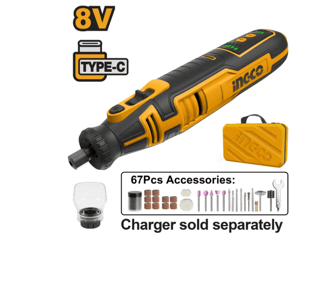 Напряжение: 8 В Скорость холостого хода: 5000–28000 об/мин Зарядка через кабель USB типа C (кабель продается отдельно) Размер цанги: 3,2 мм Регулятор скорости 67 аксессуаров 1 защитное ограждение Упаковано в холщовый мешок