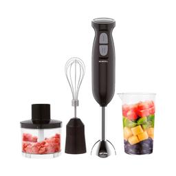 Блендер Kumtel HHB-06 — погружной блендер с двумя скоростями работы, который обеспечивает удобство использования на кухне. Устройство оснащено мощным двигателем на 300 Вт и имеет универсальный измельчитель на 500 мл для различных кулинарных нужд. Погружная часть и корпус выполнены из высококачественной нержавеющей стали, что гарантирует прочность и долговечность при ежедневном использовании. Некоторые особенности блендера: Импульсный режим. Кратковременное вращение ножей на максимальной скорости с периодическими остановками для оценки степени измельчения, а также для возможности оседания продукта на дно чаши. Защита двигателя от перегрева. Если во время работы двигатель перегреется, специальная защитная система отключит его. Возобновить работу можно будет после его остывания. Кнопка отсоединения насадок. Быстрое отсоединение ноги блендера путём нажатия двух кнопок. Аксессуары можно мыть в посудомоечной машине. Блендер подходит для приготовления различных блюд и напитков, что делает его незаменимым помощником на кухне.
