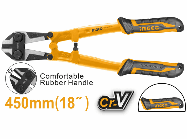 Болторез 450 мм INGCO HBC0818 INDUSTRIAL используется для перекусывания болтов, крепежных элементов, проволоки.Материал режущих губок - хромованадиевая сталь. Рукоятки из термопластичной резины препятствуют скольжению инструмента в руках. Длина инструмента - 45 см.