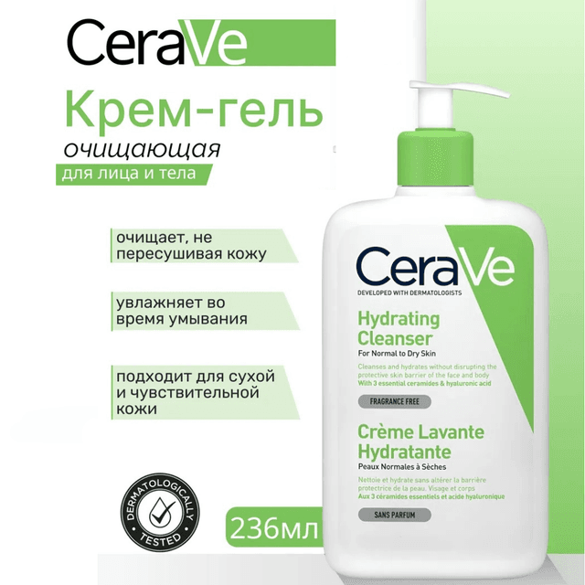 СeraVe Увлажняющий крем-гель для умывания Hydrating Cleanser – это идеальное средство для ухода за кожей лица и тела. Он разработан с использованием передовых технологий и содержит уникальные компоненты, такие как церамиды и витамин. ✅ Крем-гель обеспечивает нежное очищение и увлажнение кожи, делая ее мягкой и гладкой. Он идеально подходит для нормальной, сухой и чувствительной кожи лица и тела. ✅ Благодаря своему составу, крем-гель помогает улучшить состояние кожи, увлажняет ее на глубинном уровне, восстанавливает естественный баланс и защищает от негативного воздействия окружающей среды. ✅ Церамиды, содержащиеся в крем-геле, создают защитный барьер на поверхности кожи, предотвращая ее обезвоживание и сухость. Витамин, в свою очередь, питает и укрепляет клетки кожи, придавая ей здоровый и ухоженный вид. ✅ Крем-гель также эффективно очищает кожу от загрязнений, макияжа и излишков себума, не нарушая естественный баланс кожи. Он не вызывает раздражения и аллергических реакций, поэтому подходит для самых чувствительных типов кожи. ✅ CeraVe Hydrating Cleanser Увлажняющий очищающий крем-гель эффективно очищает и увлажняет кожу, не нарушая ее защитный барьер. Не образующий пену крем-гель мягко удаляет грязь, кожное сало и подходит для удаления макияжа. Обеспечивает интенсивное увлажнение кожи уже после первого применения. Подходит для взрослых и детей. Особенности продукта: Технология MVE последовательное высвобождение активных ингредиентов для длительного увлажнения; ✅ Гипоалергенно; ✅ Без мыла; ✅ Без сульфатов и парабенов; ✅ Без отдушки; ✅ Некомедогенно; ✅ Не закупоривает поры; Для лица и тела.