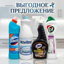 Чистящее средство Domestos (синий), 750 мл — Мощное дезинфицирующее средство для унитаза и ванной комнаты. Убивает все известные микробы, удаляет известковый налет и обеспечивает длительную гигиеническую чистоту. Универсальное чистящее средство Cif Cream, 665 г/мл — Кремообразное средство с микрокристаллами. Эффективно справляется с самыми стойкими загрязнениями на кухне и в ванной, не повреждая поверхности. Жидкий отбеливатель для белья Novitex 3 в 1, 1000 мл — Универсальный отбеливатель, который возвращает белизну вещам, удаляет пятна и дезинфицирует ткани при стирке. Средство против жира Titiz, 500 мл — Специальный спрей для быстрого удаления жира, нагара и копоти с плит, вытяжек и кухонных поверхностей.