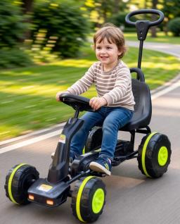 Детский веломобиль (педальный карт) с ручкой управления Этот маневренный и безопасный транспорт — отличная альтернатива обычному велосипеду. Карт приводится в движение с помощью педалей, что помогает ребенку развивать координацию и укреплять мышцы ног. Главная особенность модели — длинная родительская ручка, которая позволяет взрослым помогать малышу в управлении или контролировать скорость во время прогулки. Прочная рама и устойчивые колеса обеспечивают комфортную езду как по ровному асфальту, так и по парковым тропинкам.