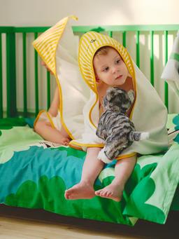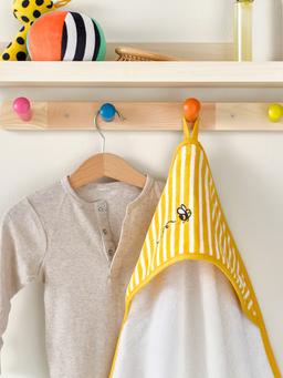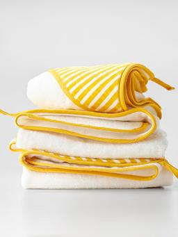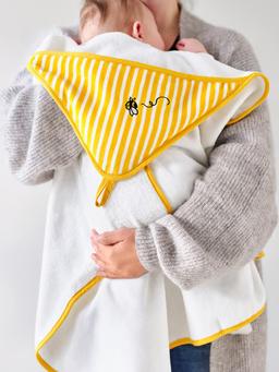 Это жёлтое детское полотенце размером 80x80 см мягкое и приятное на ощупь. Быстро впитывает влагу и подходит для ежедневного использования.