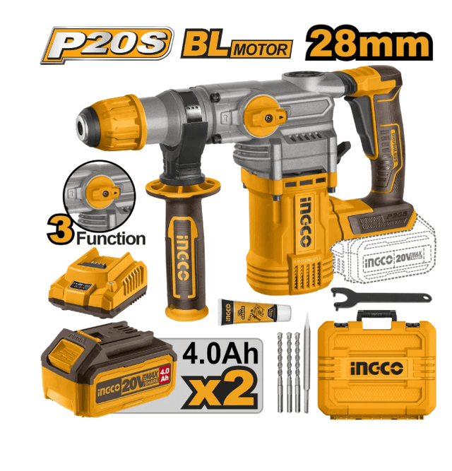 Бесщеточный двигатель Напряжение: 20 В Скорость холостого хода: 0-930 об/мин Частота ударов: 0-4400 уд /мин Энергия удара: 4,5 Дж Максимальная мощность сверления: Бетон: 28 мм Сталь: 13 мм Дерево: 40 мм Система патрона SDS Plus