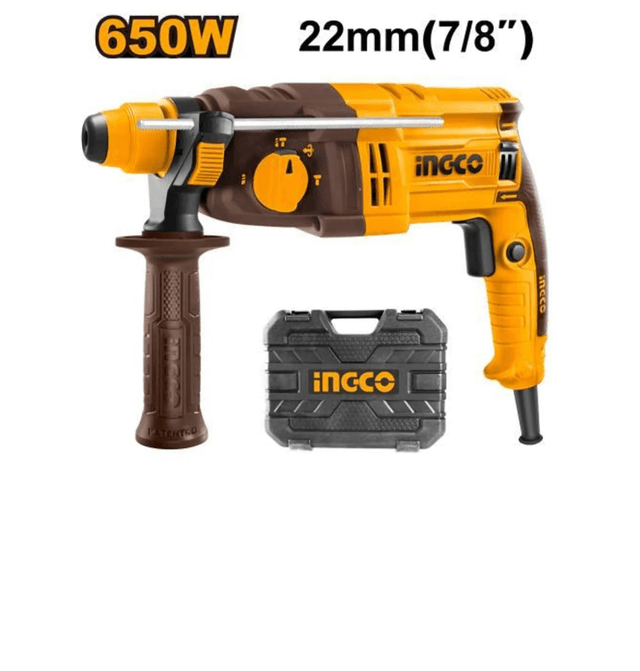 Перфоратор SDS-plus INGCO RGH6528 предназначен для бурения отверстий в бетоне и камне, а также для разрушения кирпичной кладки, пробивания штроб и борозд в бетоне, камне, кирпиче и сверления отверстий в различных конструкционных материалах в производственных и бытовых условиях. Он также пригоден для сверления отверстий в древесине, металле, керамике и синтетических материалах. Модель имеет небольшой вес и низкий уровень вибрационной отдачи, что заметно снижает утомляемость оператора и делает работу с инструментом комфортной. Ручка перфоратора является эргономичной, так как имеет две резиновые накладки с выступами и упором, тем самым, она предотвращает выскальзывание перфоратора из руки. Регулировка скорости, ударов включенного электроинструмента может быть изменена в зависимости от того, насколько сильно нажат переключатель (включения и выключения). Тип инструмента: Перфоратор SDS-plus Линейка: STANDARD Модель: INGCO RGH6528 Тип двигателя: Щеточный Мощность: 650 Вт Напряжение: 220-240В~50/60 Гц Макс. сила удара: 1,7 Дж Частота вращения шпинделя: 0-1700 об/мин Частота ударов: 0-5500 уд/мин Max диаметр сверления буром (бетон) 18 мм Max диаметр сверления буром (кирпич) 22 мм Max диаметр сверления (металл) - 13 мм Мах диаметр сверления (дерево) - 25 мм Max диаметр сверления коронкой (кирпич) 40 мм Max диаметр сверления коронкой (бетон) - 40 мм Количество режимов: 4 режима