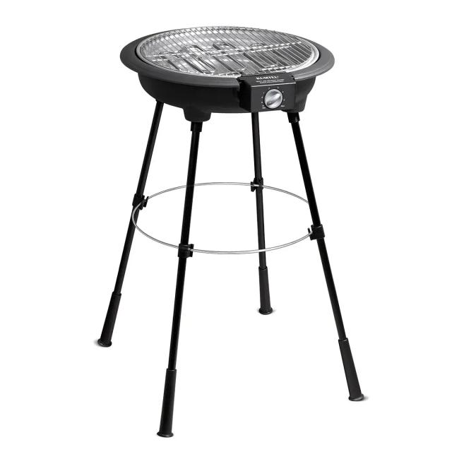 электрогриль Kumtel BM-10. Некоторые характеристики: максимальная потребляемая мощность: 2200 Вт; тип нагреваемой поверхности: решётка; возможность приготовления продуктов: барбекю, гриль, овощи, стейк, рыба; конструкция: открытая; вариант установки: напольный; ширина рабочей поверхности: 380 мм; цвет: чёрный; страна-производитель: Турция. Гриль оснащён регулируемым термостатом и защитным резистором, а для устойчивости к высоким температурам используется термопластичный материал