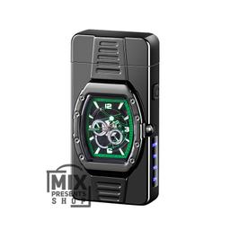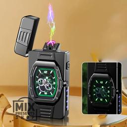 Это электроимпульсная зажигалка с часами. Она обладает следующими особенностями: Работает от встроенного аккумулятора и заряжается через USB-порт. Вместо традиционного пламени используется электрическая дуга, похожая на маленькую молнию, которая очень горячая и устойчива к ветру. Имеет встроенные кварцевые часы с аналоговым циферблатом. На корпусе присутствует индикатор заряда (от 25 до 100%).