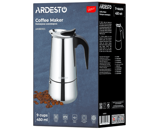 Ardesto AR0809SS — гейзерная кофеварка Gemini Apulia на 9 чашек. Некоторые характеристики: Принцип работы: горячая вода, вытесняемая под давлением пара, поднимается из нижнего резервуара в верхний через отделение с молотым кофе. Материал: нержавеющая сталь. Рукоятка: с нейлоновым покрытием, что позволяет избежать обжигов при приготовлении кофе. Объём: 450 мл, что эквивалентно девяти чашкам кофе. Совместимость: подходит для газовых, электрических, стеклокерамических и галогенных плит. Цвет: нержавеющая сталь с чёрным. Особенности: не рекомендуется мыть в посудомоечной машине. Страна-производитель: Китай.