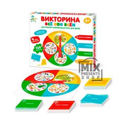 Детская настольная игра "Все обо всем", развивающая игра-викторина, карточная викторина с вопросами, в наборе поле со стрелкой, 150 вопросов на 4 темы. Настольная развивающая игра-викторина "Все обо всем" развивает эрудицию, мышление, расширяет кругозор. Играйте и узнавайте новые факты из таких областей знаний, как история, биология, география, наука и техника. В эту игру можно играть с друзьями! Как играть: Перед началом игры нужно разделить карточки по темам, сложить стопками текстом вниз и выбрать ведущего, который будет зачитывать вопросы. Если игра проходит без ведущего, то вопросы друг другу зачитывают игроки. Внимание! Правильные ответы указаны в карточках в скобках. Возраст: 6+