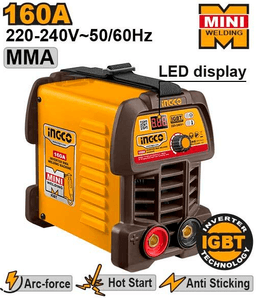 Технология инвертора IGBT Входное напряжение: 1~220-240 В Частота: 50/60 Гц Выходной ток: 15-160 А Рабочий цикл: 160 А при 30% Светодиодный дисплей Напряжение холостого хода: 81 В Максимальный выходной ток: 160 А Диаметр электрода: 1,6-3,2 мм Антипригарное покрытие/Горячий старт/Форсаж дуги
