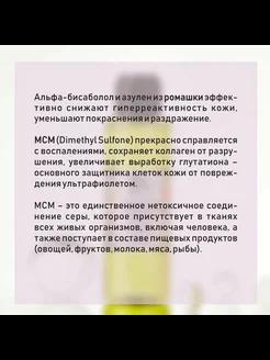 Успокаивающий тоник для гиперчувствительной и раздражённой кожи с МСМ и ромашкой Для чего: Мягкий уход и восстановление чувствительной, гиперреактивной и раздражённой кожи. Успокаивает, увлажняет, уменьшает воспаление и покраснение. Что решает: ✔ Снимает раздражение, зуд и покраснение ✔ Уменьшает чувствительность кожи к внешним раздражителям ✔ Подходит после воздействия солнца и других агрессивных факторов ✔ Защищает от повреждений, восстанавливает барьерную функцию кожи ✔ Увлажняет и поддерживает комфорт даже реактивной кожи Активные компоненты и их свойства: 🔹 Альфа-бисаболол и азулен (ромашка) — натуральные противовоспалительные компоненты, эффективно снижают покраснения, зуд и раздражение, восстанавливают комфорт кожи 🔹 МСМ (Dimethyl Sulfone) — биодоступная форма серы, содержащаяся в организме — укрепляет кожу, обладает противовоспалительным действием — способствует выработке глутатиона, защищающего клетки от УФ-повреждений — сохраняет коллаген, поддерживает упругость и эластичность кожи 🔹 Слабокислый pH = 5 — соответствует естественному pH кожи, способствует балансу микрофлоры и выработке церамидов — помогает восстановить эпидермальный барьер и нормализовать уровень увлажнённости Подходит для: – Чувствительной и реактивной кожи – Кожи, склонной к покраснению, зуду, раздражению – Восстановления после пребывания на солнце или воздействия агрессивных факторов – Обезвоженной кожи (возможна лёгкая реакция в начале применения) Способ применения: Нанести небольшое количество на ватный диск и аккуратно протереть кожу лица после умывания. Не смывать. Дать впитаться.