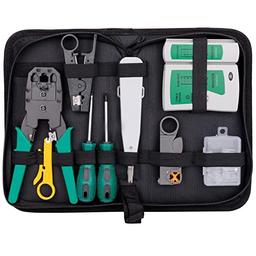 Профессиональный расширенный комплект из 14 предметов, предназначенный для полной настройки, монтажа и диагностики компьютерных и телефонных сетей. Набор поставляется в удобной износостойкой сумке на молнии, которая обеспечивает сохранность инструментов и удобство при транспортировке. Основные составляющие набора (14 предметов): Кримпер: Профессиональный инструмент для обжима разъемов RJ45/RJ11. Кабельный тестер: Для проверки целостности жил и правильности обжима. Инструмент для заделки (Punch Down): Для работы с патч-панелями и розетками. Стрипперы: Различные ножи для снятия изоляции и резки кабеля. Набор отверток: Шлицевая и крестовая для разборки оборудования. Набор коннекторов RJ-45: В специальном боксе. Запасные лезвия и аксессуары.