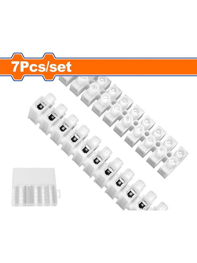 Комплект из 7 клеммных колодок Материал: полипропилен + цинковый сплав Размер: 1,5-2,5 мм² Каждая с 12 отверстиями Сертифицировано CE Упаковано в пластиковую коробку