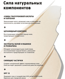 Увлажняющий крем-праймер для лица с гиалуроновой кислотой и натуральными экстрактами выравнивает цвет и текстуру кожи, маскирует поры и мелкие морщинки, усиливает естественное сияние кожи, комфортно распределяется и продлевает стойкость макияжа. — защищает от UVA и UVB излучения (SPF 15) — создаёт эффект здорового сияния — выравнивает текстуру кожи, маскируя поры и мелкие морщинки — продлевает стойкость макияжа и способствует комфортному нанесению — защищает от факторов окружающей среды и агрессивных воздействий косметики — содержит комплекс из четырёх видов гиалуроновой кислоты и церамидов, которые эффективно удерживают влагу в коже и укрепляют защитный барьер Объём 65 мл