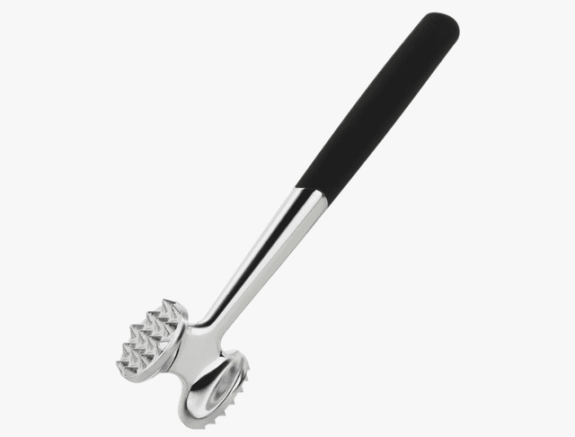 Ardesto Black Mars AR2019SA — кухонный молоток для отбивания мяса. Особенности: изготовлен из цинкового сплава и пластика; ручка правильно распределяет центр тяжести и упрощает отбивание мяса; имеет две рабочие стороны для разных типов обработки мяса: гладкую для выравнивания и рельефную для размягчения; можно мыть в посудомоечной машине; вес — 290 г, длина — 225 мм. Размеры: 22,5 × 5 × 3,5 см. Страна производства: Китай