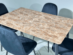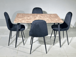 Обеденный комплект MDS в исполнении "Коричневый мрамор и Черный" – это смелое, контрастное и современное решение для кухни или столовой. Прямоугольный стол размером 120 см×80 см предлагает достаточно пространства для комфортного размещения четырех персон, сочетая функциональность и высокий стиль. Дизайн и Материалы: Столешница изготовлена из прочного высокоплотного МДФ с покрытием, точно имитирующим богатую текстуру коричневого мрамора. Глубокий рисунок мрамора придает столу элемент роскоши, а защитное покрытие обеспечивает долговечность, устойчивость к царапинам, влаге и легкую очистку. Каркас, ножки стола и каркасы стульев выполнены в строгом черном цвете. Этот контрастный, матовый черный цвет не только обеспечивает высокую стабильность конструкции, но и подчеркивает изысканность мраморной столешницы, создавая сильный визуальный акцент, который идеально впишется в современные и индустриальные интерьеры. В комплект входят четыре стула с черными каркасами. Мягкие сиденья (обитые износостойким материалом) обеспечивают исключительный комфорт и завершают этот лаконичный и стильный обеденный ансамбль. Комплект MDS – это сочетание элегантности, контраста и практичности, которое преобразит Ваше обеденное пространство.
