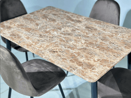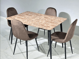Обеденный комплект MDS представляет собой стильное и практичное решение, сочетающее в себе элегантность мрамора и теплоту дерева. Прямоугольный стол размером 120 см×80 см обеспечивает комфортное пространство для четырех персон, делая его идеальным для ежедневных трапез и приема гостей. Дизайн и Материалы: Столешница выполнена из прочного высокоплотного МДФ с покрытием, имитирующим роскошный коричневый мрамор. Этот принт не только придает столу изысканный вид, но и делает его устойчивым к царапинам, влаге и высоким температурам. Контрастные ножки и каркас стола, а также каркасы стульев выполнены в глубоком темно-коричневом цвете с текстурой дерева. Это сочетание создает визуальный акцент и придает комплекту солидный и современный вид. Стулья (4 шт.) в комплекте идеально гармонируют со столом. Их устойчивый каркас в цвете темно-коричневого дерева обеспечивает надежность, а мягкие сиденья гарантируют удобство при длительном сидении. Комплект MDS – это долговечное, легкое в уходе и эстетически привлекательное дополнение к любому современному интерьеру.