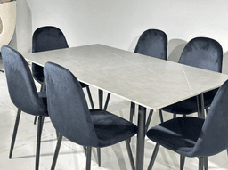 Этот кухонный комплект сочетает в себе стилистический контраст серой керамической столешницы и черного каркаса. Керамическая столешница стола отличается исключительной устойчивостью к горячим предметам, царапинам и влаге, обеспечивая максимальное удобство в эксплуатации. Размер 140 x 80 см в комплекте с 6 стульями позволяет с комфортом разместить 6 человек. Сочетание черного и серого цветов придает любому современному интерьеру элегантность и глубину. Ключевые преимущества: Контрастный Дизайн: Сочетание серой керамики и черного металлического каркаса создает эффектный и современный вид. Керамическая Столешница: Долговечная и гигиеничная, максимально устойчива к кухонным условиям. Оптимальный Размер (140x80 см): Позволяет разместить 6 человек, обеспечивая удобные посадочные места. Качественные Стулья: 6 стульев гармонируют по стилю со столом, имеют удобную посадку и прочный черный каркас. Современная Элегантность: Комплект привносит в интерьер чистые линии и стильное цветовое сочетание. Уход: Керамическую столешницу протирать влажной тканью. Каркас стульев протирать мягкой тканью.