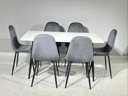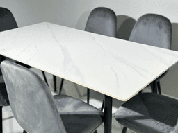 Кухонный стол с белой керамической поверхностью и 6 серых стульев