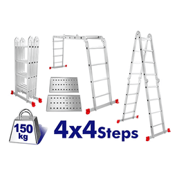 Лестница-стремянка Emtop ELAD4441 — это усиленная многофункциональная лестница-трансформер, состоящая из 4 секций по 4 ступени. Благодаря шарнирным соединениям, она может использоваться как приставная лестница, двухсторонняя стремянка, Г-образная лестница или рабочая платформа. Изготовлена из высококачественного алюминиевого профиля, что обеспечивает идеальный баланс между весом и прочностью. Основные характеристики: Материал: алюминий Конфигурация: 4 секции по 4 ступени (всего 16 ступеней) Максимальная высота (в разложенном виде): около 4500 мм Высота в режиме стремянки: около 2200 мм Максимальная нагрузка: 150 кг Особенности: стальные фиксирующие шарниры, две широкие траверсы для максимальной устойчивости, компактность при хранении.