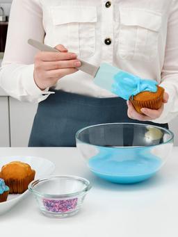 Лопатка размером 26 см в голубых и бежевых тонах предназначен для равномерного нанесения крема на торты и другие десерты. Удобный и простой в использовании.
