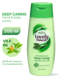 Лосьон для рук и тела Emeron Lovely Naturals Deep Caring 200мл разработан для глубокого питания и защиты вашей кожи. Глубокое питание: Формула для интенсивного питания кожи, помогающая сохранить ее здоровой и эластичной. Экстракт зеленого чая: Часто содержит экстракт зеленого чая, известный своими антиоксидантными свойствами, которые могут помочь защитить кожу от вредного воздействия окружающей среды и предотвратить ее сухость.