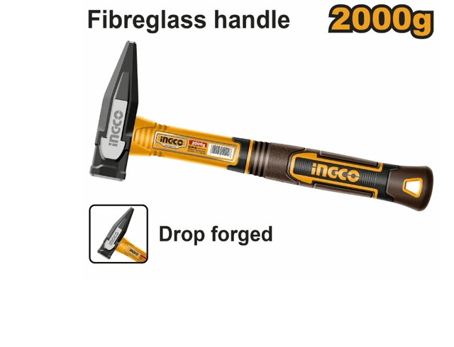 Вес: 2000 г. Инновационная кованая головка молотка. Термическая обработка, углеродистая сталь 45#. Прочная трехцветная ручка из стекловолокна для удобного захвата. Упаковано этикеткой.