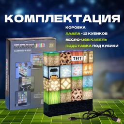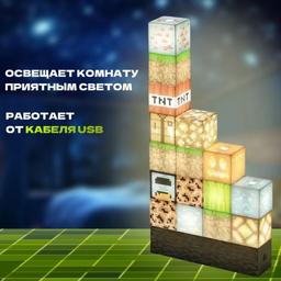 Лампа светильник, сделанная в виде 16 кубиков блоков из игры Майнкрафт. Лампа сделана по мотивам известной компьютерной игры. Великолепный подарок для всех фанатов и не только. Освещает комнату приятным светом, поднимая настроение владельцам и даря уют. Легка и интуитивна в управлении. Теперь нечего бояться ночью! Кроме этого лампа является конструктором, можно собрать разные композиции из 16 блоков, и она также будет гореть! Работает от кабеля USB. Производство: Китай Размер: 12*3*15,3 см