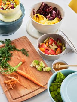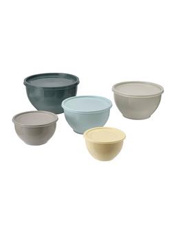 Этот набор из 5 мисок разных цветов с крышками удобен для хранения пищи. Каждая миска имеет свой цвет, что облегчает организацию на кухне. Крышки сохраняют еду свежей и чистой.