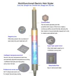 Отрицательные ионы | до 400 миллионов Температура | 70 ℃ - 90 ℃ Двигатель BLDC | 110 000 об/мин Максимальная скорость воздушного потока | 22 м/с Шум | < 80 дБ Мощность | 1400 Вт Напряжение | 220-240 В, 50/60 Гц Длина шнура | 2 м