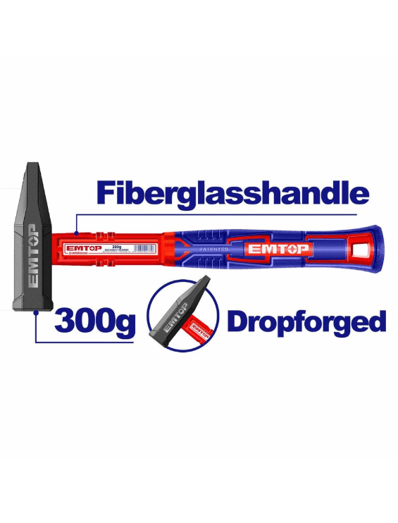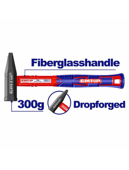 EHAMMH0300 — слесарный кованый молоток бренда EMTOP. Характеристики: вес: 300 г; материал: углеродистая сталь 45#; термообработка; рукоятка из стекловолокна уникального дизайна.