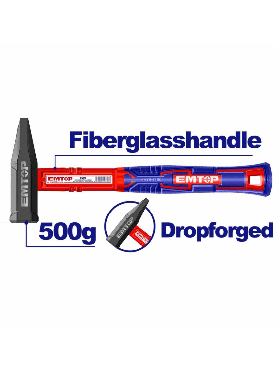 EHAMMH0500 — слесарный молоток бренда EMTOP. Характеристики: вес: 500 г; кованая головка; материал: углеродистая сталь 45#; термообработка; уникальная дизайнерская ручка из стекловолокна.