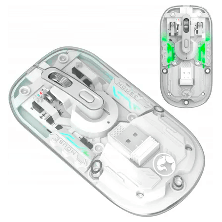Общие характеристики: Тип: Оптическая, беспроводная. Подключение: Двойной режим беспроводного подключения: 2.4G: Через комплектный USB-приемник. Bluetooth: Версия 5.1. Радиус действия: До 10 метров. Цвет: Белый. Функции и особенности: Количество кнопок: 4 кнопки. Подсветка: RGB-подсветка с 7 цветами. Корпус мыши прозрачный, что усиливает визуальный эффект подсветки. Ресурс нажатий: Левая и правая кнопки имеют тихие переключатели с ресурсом до 3 миллионов кликов. Дизайн: Симметричный, подходит для обеих рук. Питание: Аккумулятор: Встроенный перезаряжаемый, ёмкостью 400 мач. Зарядка: Осуществляется через кабель (возможно, USB-C или Micro-USB, обычно входит в комплект). Размеры и вес: Размеры: 113 x 58 x 25 мм. Вес: 63 г.