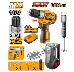 Напряжение: 16 В 1 шт. Бесщеточная аккумуляторная компактная дрель (CDLI16681) 1 шт. Беспроводной ручной блендер (CHB047K) 1 шт. Беспроводной ручной миксер (CHM022K) Бесщеточная аккумуляторная компактная дрель (CDLI16681): Бесщеточный двигатель Скорость без нагрузки: 0-550/0-2000 об/мин Максимальный крутящий момент: 60 Нм Металлический патрон Емкость патрона: 13 мм Настройки крутящего момента: 22+1 Автоматическая блокировка быстрозажимного патрона Механическая 2-скоростная передача Функция блокировки шпинделя Встроенная светодиодная рабочая подсветка Беспроводной ручной блендер (CHB047K): Мощность: 100 Вт Стержень для смешивания из нержавеющей стали 5-скоростной регулятор Светодиодный дисплей 2 лезвия из нержавеющей стали Имеет функцию смешивания сока или соуса Беспроводной ручной Миксер (CHM022K): Мощность: 125 Вт 7-скоростной регулятор Светодиодный дисплей Отдельная кнопка извлечения Отдельно стоящая конструкция для удобства хранения Включает: 1 шт. Cr-V 65 мм бита 2 шт. венчики 2 шт. крючки для взбивания