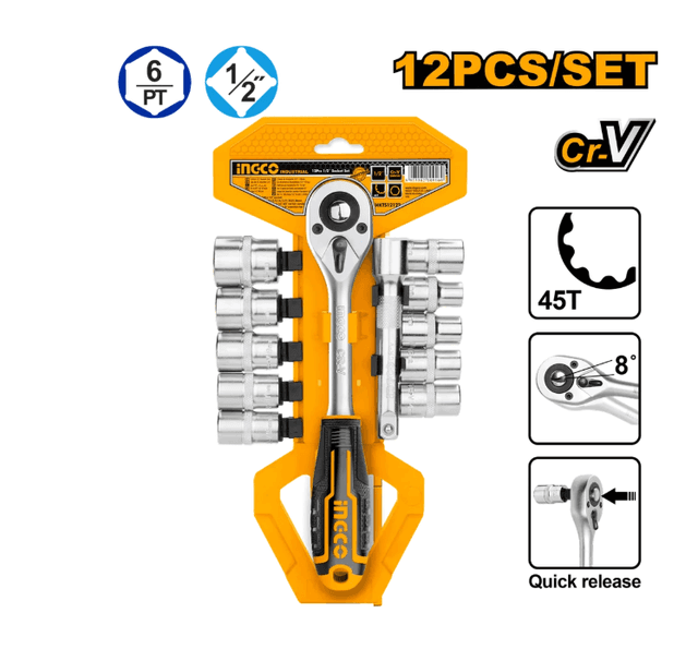 Набор головок 1/2" с трещоткой 12 шт В наборе: Торцевые головки 10шт: 10, 11, 12, 13, 14, 15, 17, 19, 21, 24 Ключ трещоточный 45Т 1/2": 1шт Удлинительная насадка 5": 1шт Материал: Cr-V Высоко качественная сталь 50BV30 Отполированное и хромированное покрытие Упаковка: пластиковый подвес