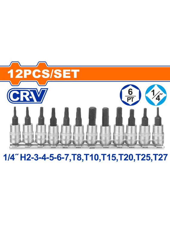Набор головок для бит 1/4 дюйма, 12 шт. В комплект входят: 6 головок головок для бит Dr. 1/4 дюйма: H2-3-4-5-6-7 6 головок головок для бит Dr. Torx 1/4 дюйма: T8, T10, T15,T20,T25,T27 Размер привода: 1/4" Материал бит: Cr-V Материал головки: сталь 50BV30 (Cr-V). Термическая обработка. Хромированное покрытие. Упаковано в двойной блистер.