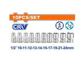 Набор из 10 головок 1/2 дюйма. Тип головки: шестигранник. В комплект входит: 10 головок головок 1/2 дюйма: 10,11,12,13,14,15,17,19,21,24 мм. Материал: 50BV30, высококачественный Cr-V.