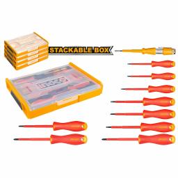 «Набор изолированных ручных инструментов из 10 шт.» Включать: 1 шт. Отвертка SL3.0x75 мм 1 шт. Отвертка SL4.0x100 мм 1 шт. Отвертка SL5,5x125 мм 1 шт. Отвертка SL6,5x150 мм 1 шт. Отвертка PH0x60 мм 1 шт. Отвертка PH1x80 мм 1 шт. Отвертка PH2x100 мм 1 шт. отвертка PZ1x80 мм 1 шт. отвертка PZ2x100 мм 1 шт. тестовый карандаш (испытательное напряжение: 100-500 В переменного тока) Упаковано в штабелируемую пластиковую коробку"