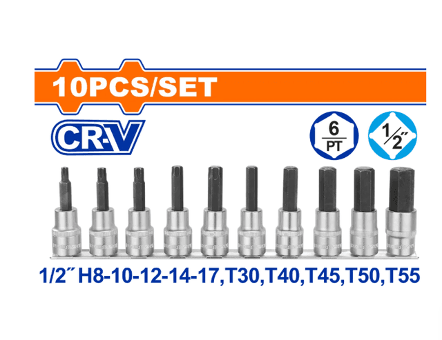 10 шт. Набор головок для бит 1/2 дюйма В комплект входят: 5 шт. головка для бит Dr. Hex 1/2 дюйма: H8-10-12-14-17 5 шт. головка для бит Dr. Torx 1/2 дюйма: T30, T40, T45, T50,T55 Размер привода: 1/2" Материал бит: Cr-V Материал головки: сталь 50BV30 (Cr-V) Термическая обработка Хромированное покрытие Упаковано в двойной блистер