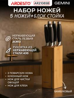 Ardesto AR2106SB — набор из пяти ножей серии Gemini. В комплект входят два поварских ножа, универсальный нож, нож для хлеба, нож для овощей и бамбуковый блок. Характеристики: лезвия изготовлены из нержавеющей стали 2CR13; ручки — из нержавеющей стали 430 с покрытием TPR; длина ножей: для овощей — 8,9 см, для хлеба — 12,7 см, поварской — 15,2 см, универсальный — 20,3 см; цвета, используемые в оформлении: коричневый, стальной, чёрный; размеры упаковки: 13 × 35,5 × 9,5 см; вес с упаковкой — 1,61 кг.
