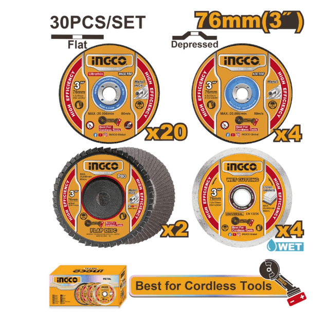30 шт./компл. 20 шт. абразивный отрезной диск по металлу: 76 мм (3 дюйма) x 1,2 мм (3/64 дюйма) x 10 мм (25/64 дюйма) 4 шт. абразивный шлифовальный диск по металлу: 76 мм (3 дюйма) x 4,0 мм (5/32 дюйма) X10 мм (25/64 дюйма) 4 шт. мокрый алмазный диск: размер: 76 (3 дюйма), диаметр: 10 мм, ширина лезвия: 7 мм 2 шт. лепестковый диск: 76 (3 дюйма), диаметр: 10 мм, p80 Подходит для CAGLI7601 CAGLI76011 CAGLI76012 CAGLI76017 UCAGLI76017 Упакован в цветную коробку.