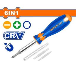 Набор отверток 6 в 1. Материал: CR-V. 6 функций в 1. Отвертка: с 2 двусторонними битами: 6,35*65 мм, PH1+SL5 8,00*75 мм, PH2+SL6. С 2 головками: 6 мм, 8 мм. С 1 сменной ручкой отвертки уникального дизайна. Упаковано в цветную коробку.