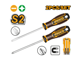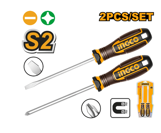 Набор из 2 отверток Материал лезвия: S2 Тип хвостовика: круглый 1 шт SL6.5*6*125 мм 1 шт PH2*6*125 мм Материал ручки: трехцветная эргономичная С сильным магнитом Упакован в двойной блистер