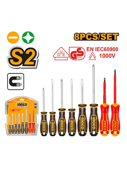 Набор из 8 отверток с круглым хвостовиком Включает: 6 отверток S2: SL4*4*100 мм SL5.5*5*100 мм SL6.5*6*150 мм PH0*3*75 мм PH1*5*100 мм PH2*6*150 мм 2 отвертки с изоляцией CR-V: PH2*6*100 мм SL5.5*5*125 мм 1000 В, сертификация VDE+GS Упаковано в двойной блистер