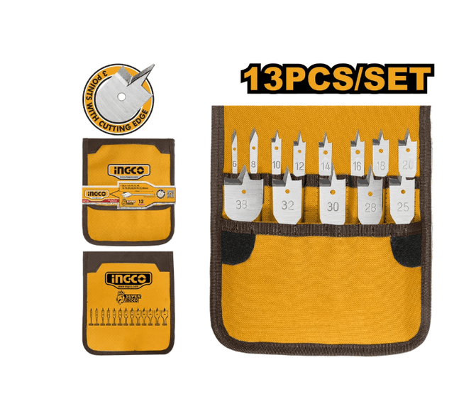 Набор плоских сверл по дереву из 13 шт. Размер (мм): 6,8,10,12,14,16,18,20,25,28,30,32,38 Хвостовик: 1/4 " шестигранник Длина: 152 мм Упаковано в холщовый мешок